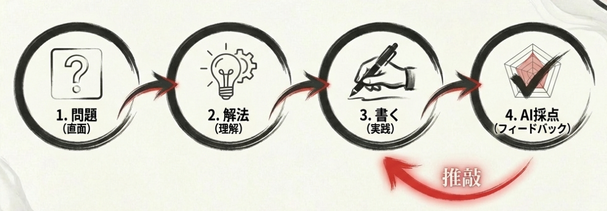 英検1級のライティングは、「知っている」だけでは通用しません。本番で確実に書けるようになるには、繰り返し手を動かし、自分の弱点と向き合い、磨き続けるプロセスが不可欠です。ライティング・フォージは、その反復を最大限に効率化するために、次の4つのステップで学習を進めます。
